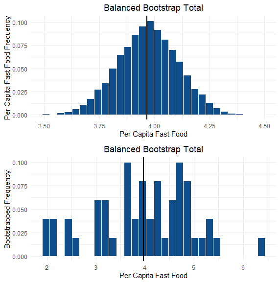 50 states, whereas the other is a bootstrap of the sample. What is a bootstrap? And why do we use it here? A bootstrap sample is where we take a sample of our data, but do not replace the data after we draw a point. In our case, after we choose a state,